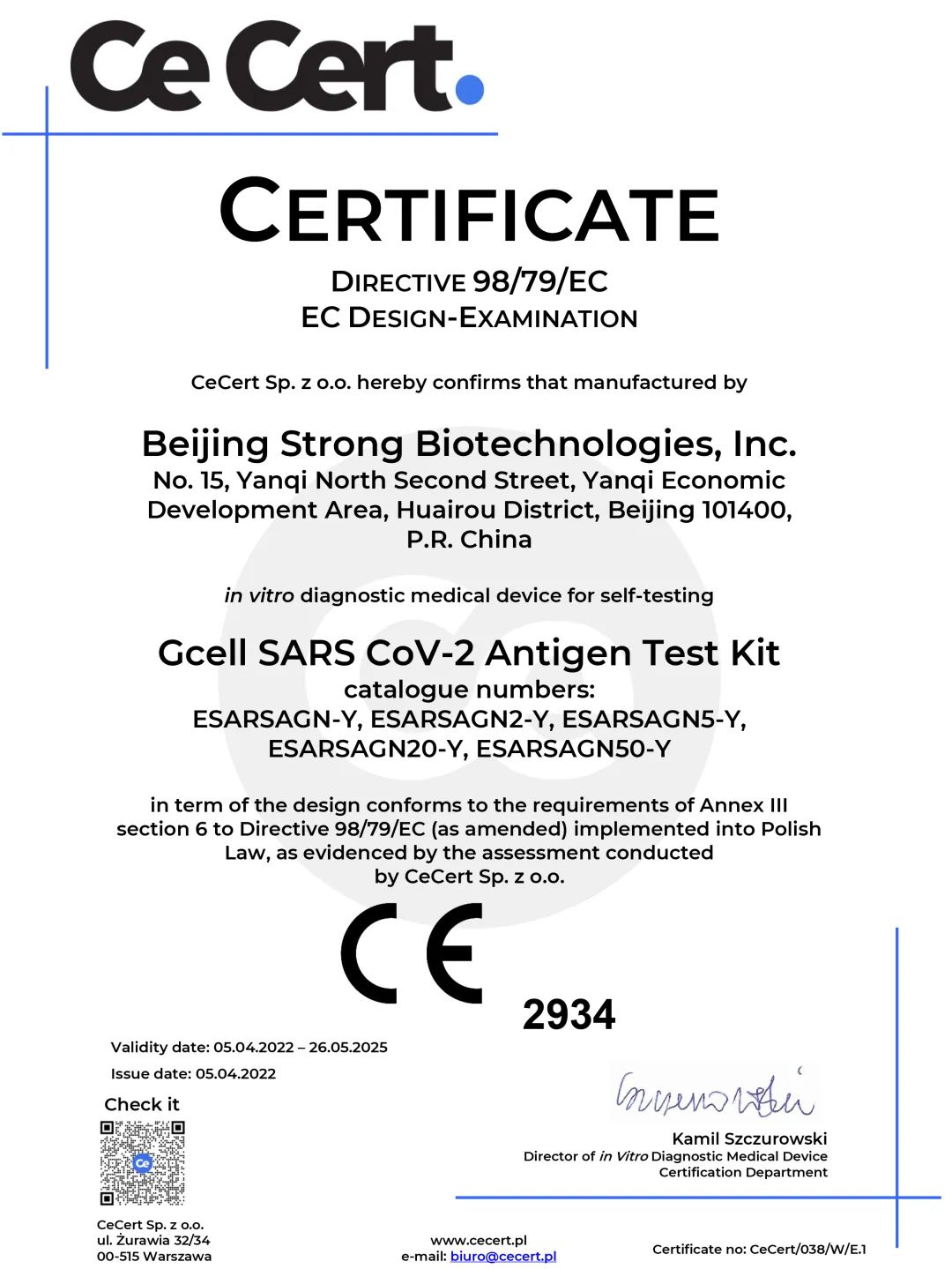 九強生物新型冠狀病毒抗原自測試劑盒(SARS CoV-2 Antigen Test Kit)于2022年4月5日取得歐盟CE準入資格!這意味著該自測試劑盒可在歐盟國家以及認可歐盟CE認證的國家進行銷售。