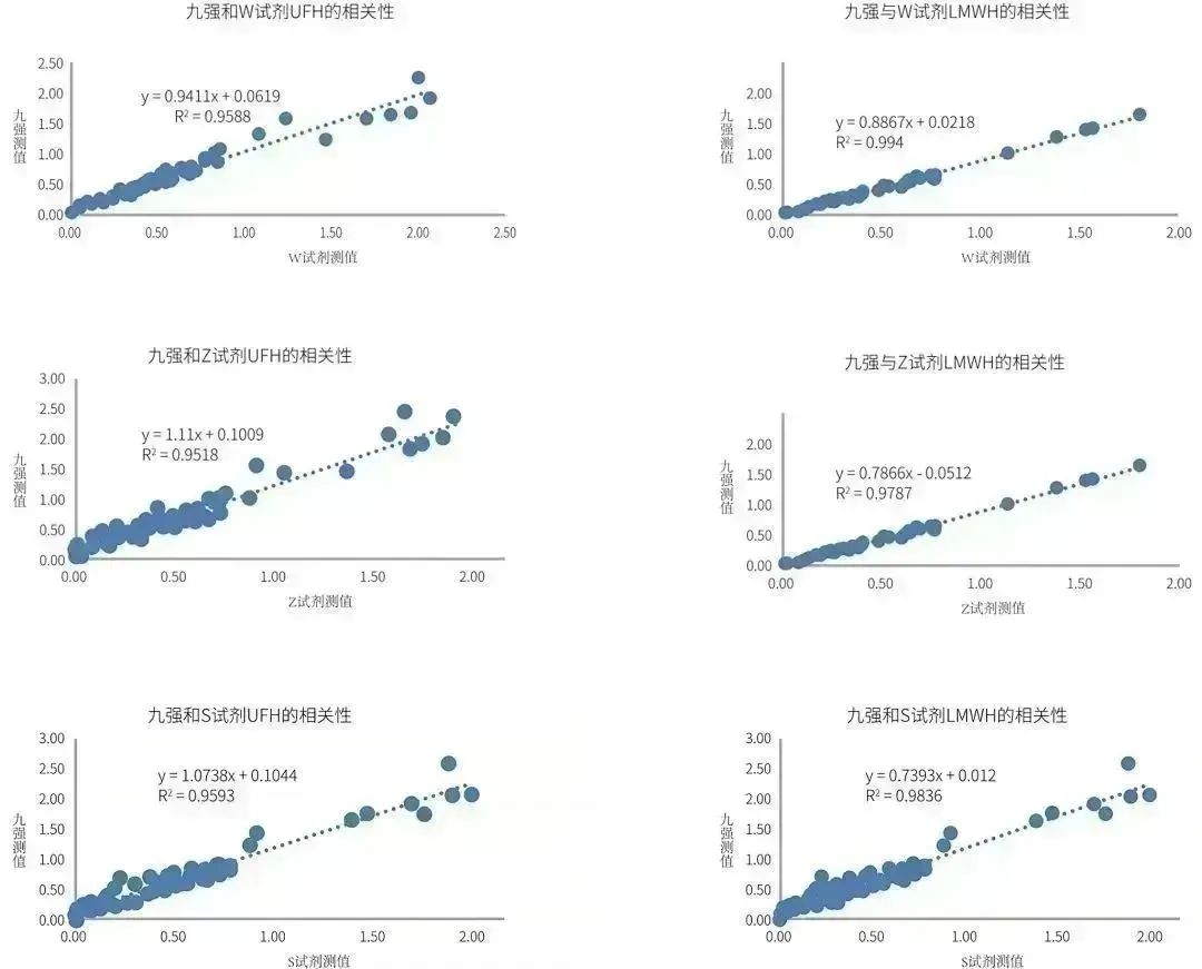 九強抗Xa測定試劑盒(發色底物法)通過顏色變化來測定抗凝強度/血藥濃度,線性寬,抗干擾能力強,精密度高,與市場主流廠家試劑相關性良好,R2>0.95,可滿足臨床檢測需求。
