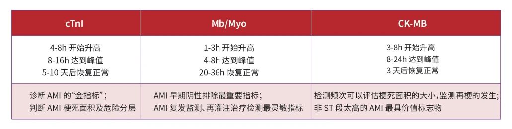 心臟細胞胞質中含量豐富,具有高度心臟特異性,AMI發作后20min開始升高,1~3h內可以在血中檢測出,4~6h達到峰值,20~30h內血漿中的濃度恢復正常水平,其釋放量與心肌損傷范圍成正比。
