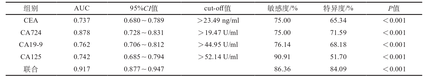 研究表明,血清CA72-4聯合CEA、CA19-9、CA125診斷胃癌的AUC大于各指標單獨診斷,靈敏度、特異度分別為86.36%、84.09%,表明血清CA72-4、CEA、CA19-9、CA125 聯合可提高胃癌診斷價值。