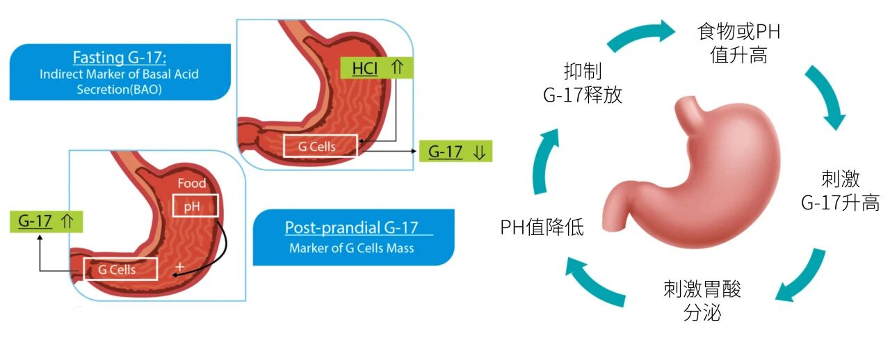 G-17與胃酸形成負反饋機制,胃竇功能正常時該機制可維持胃酸分泌的動態平衡;當胃竇萎縮時,該機制失衡。